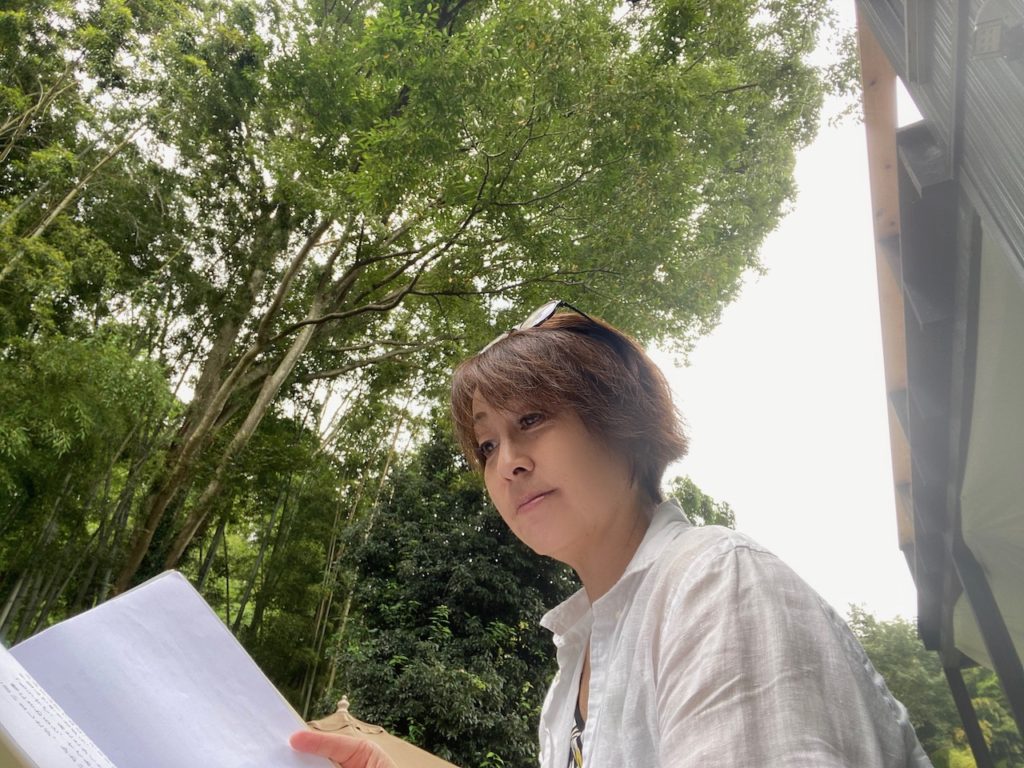 雨だけど、ちょっと寒いけど、プライベートテラスで、文化庁プロジェクトの朗読に取りかかってます!原作から朗読台本に起こす作業です。難儀ですが、楽しゅうございます撮影も入るので、ますます楽しみ -
