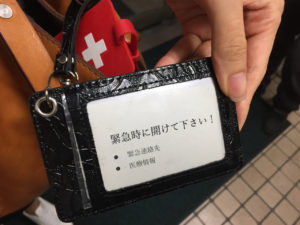 「両面クリアのパスケースを見つけました!」。そう言って見せてくれたバッグに携帯しているパスカードの片側に、「緊急時に開けてください!」とだけ書かれたカードが入っていました。もう片方には名前のみ記入されたヘルプカード。これなら、通常持ち歩いている時、過剰な個人情報をオープンにすることがなくセキュリティにも配慮でき安心です。会話ができない状態に陥った時、このパスケースを見せる、または、このパスケースを見つけた方が躊躇することなく中の情報を開示することができます。