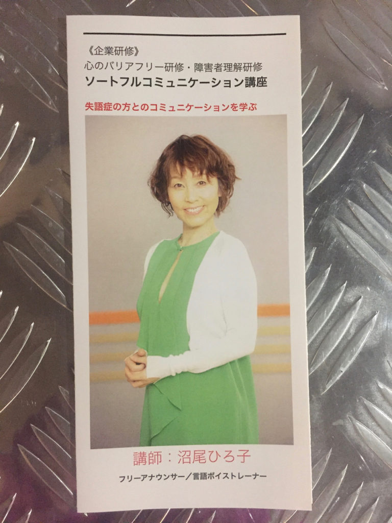 企業研修〜心のバリエアフリー研修「失語症の方とのコミュニケーションを学ぶ」がいよいよスタートします。ホテル、旅館、飲食店、美容室、各種店舗etc・・。さまざまなサービス業の現場で働く方の、失語症って?どのようなサポートが適切なの?といった疑問、不安を解消し、コミュニケーションを学ぶ講座です。ユニバーサルデザイン2020の指針もあって障害のある方とのコミュニケーションは企業研修の課題となっています。 知ることで生まれるやさしい時間を作ることが共生社会の実現だと思います。ぜひ企業研修に取り入れてください。ホームページもまもなくアップします。