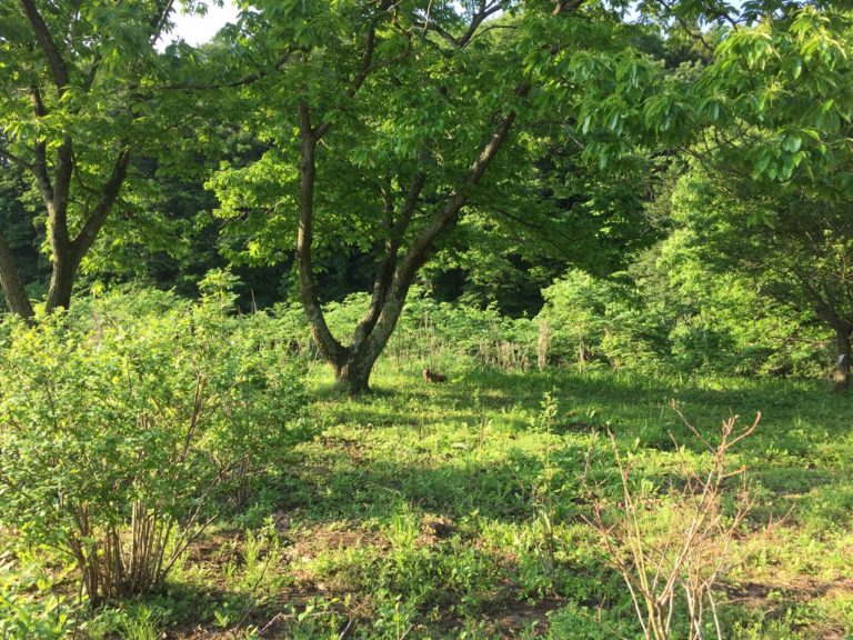 朝の静かな時間に、このブルーベリー畑を歩くのが好きです。今日は、思いもしない出会いもありました。栗の木の下に、見えますか? タヌキです。ちょこちょこ歩いてきて、私と目が合うと、しばらく立ち止まって、何事もなかったかのように行ってしまいました。まるで、自分の散歩コースになんでアンタがいるの? みたいな、そんな顔してました。そうか・・、私の方が、よそ者なのか・・・。そんな不思議な時間。