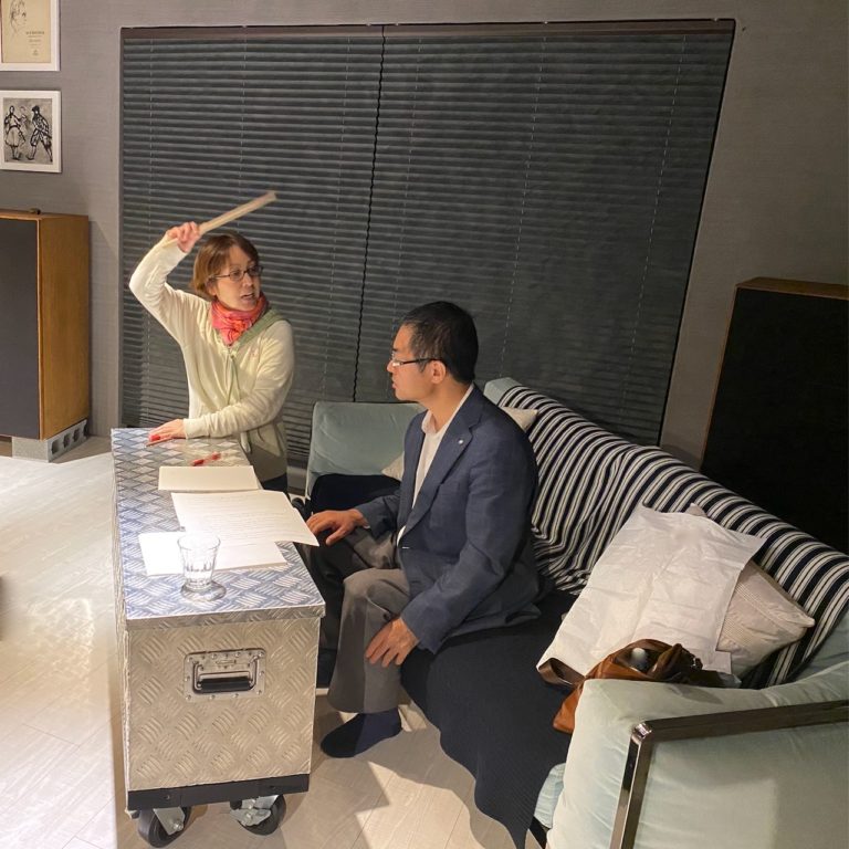 いくつかのテキストの中からご本人が読みたいと思う物語を朗読テキストにしています。同じ朗読テキストでも教える内容はひとりひとり違います。前回即読したので、今日は意味の理解に進みました。その上で、安定した声量による表現力を養います。そこで登場したのが魔法のスティック⁈ 一音一音ではなく語として音のイメージを高低、膨らませ方、しまい方で覚えていきます。魔法のスティックは目で見てわかるように私が振っていきます。家でも練習できるように台本に記号を記入していきました。