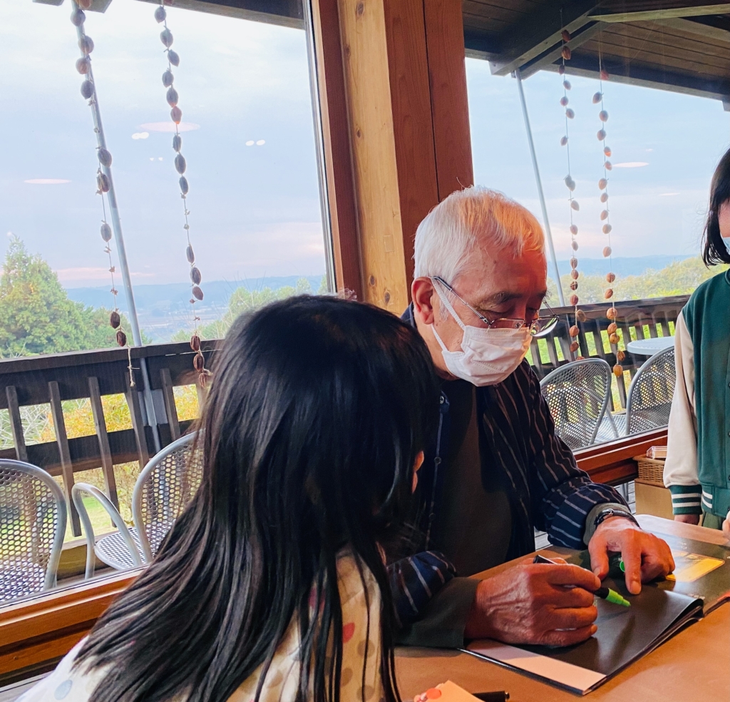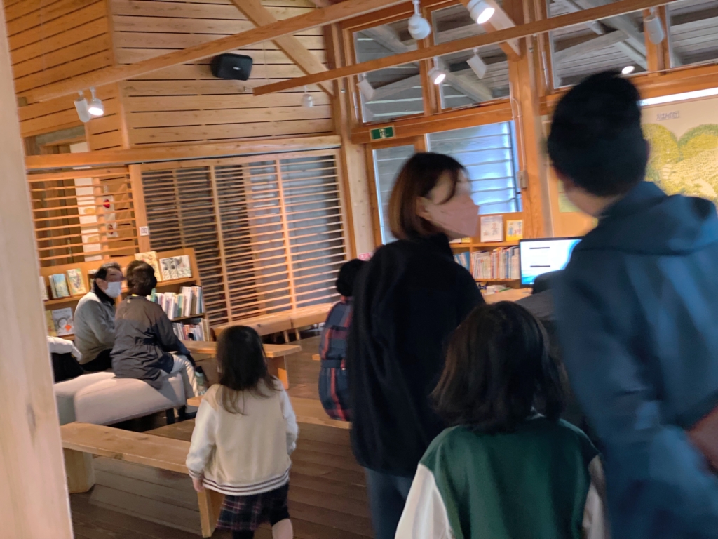 だって、ほんとうなんです。せんせいはやさしくて、こどももおとなもあたたかい毛布にくるまれるような気持ちになっちゃう。私もです。始まる前、テラスに出てムササビや干し柿の話を聞いているだけで、せんせいの絵本の世界にいるようで、しあわせなのでした。
