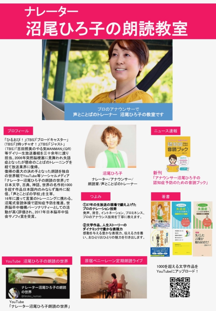 脳梗塞によって失語症となり絶望の淵から救ってくれたのも朗読だった。朗読は、私の人生を変えてくれた。朗読には心もからだも元気になるすべてはつまっている。そのことを多くのひとに知ってもらいたいと心の底から思う。