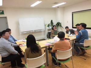 電話応対は定例文の復唱からスタートし、その後2人ひと組で定例文を使った受け答えをしてもらいました。まったくプリントを使わずに音とイメージで行おうとしましたが、目の前にいるひとと電話のシチュエーションをイメージすることは少し難しかったようで、ホワイトボードに定例文を書くことにしました。最初の音さえ出れば、繰り返していくうちに電話してる風になって練習できたようです。このように、実践で役立つトレーニングをこれからも増やしていこうと思っています。